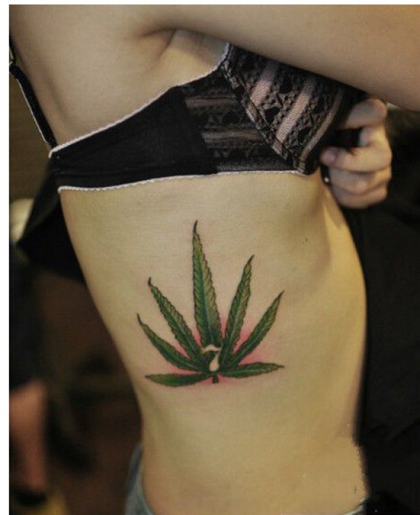 性感女生侧腰好看的绿色树叶数字纹身图片