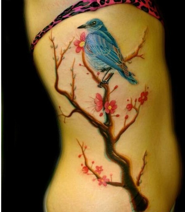 性感女生侧腰精美好看的梅花小鸟纹身图片