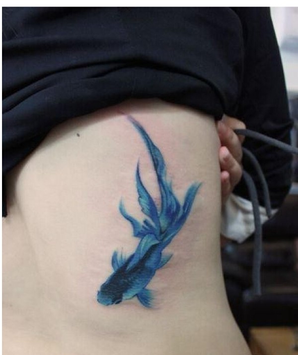美女侧腰漂亮好看的彩色小金鱼纹身图图片