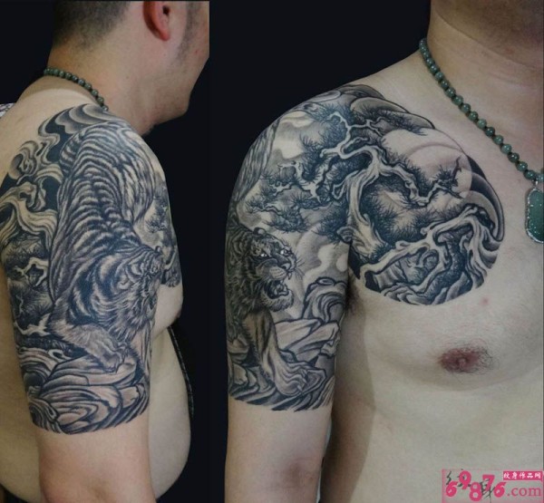 披肩霸气老虎松树纹身图片