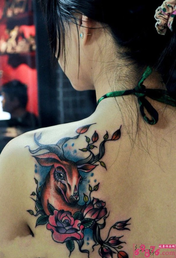 女生肩花纹身_15张女性双肩对称的肩花纹身图案作品图片