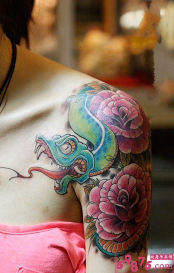 创意清蝰蛇与玫瑰霸气纹身图片