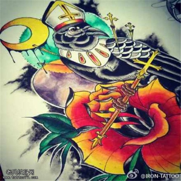 彩色月亮猫头鹰玫瑰纹身手稿图片