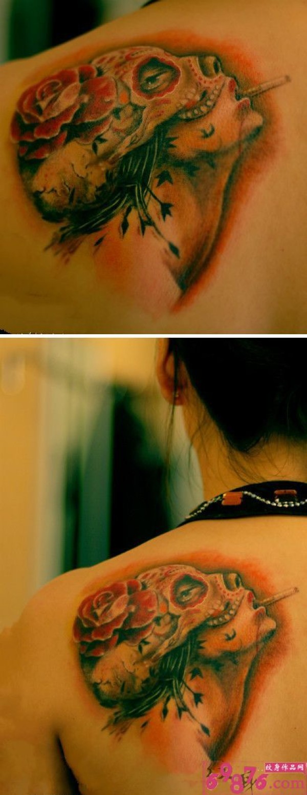 骷髅面具抽烟美女个性纹身图片