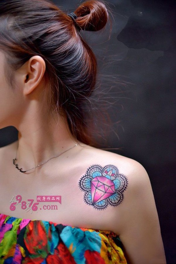 时尚粉色钻石肩部纹身图片