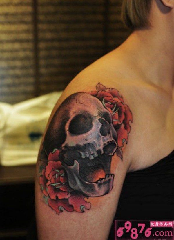 女生手臂经典潮流的骷髅与玫瑰花纹身图案