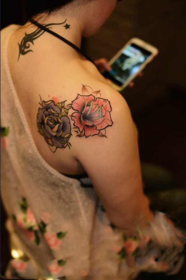 女生肩花纹身_15张女性双肩对称的肩花纹身图案作品图片