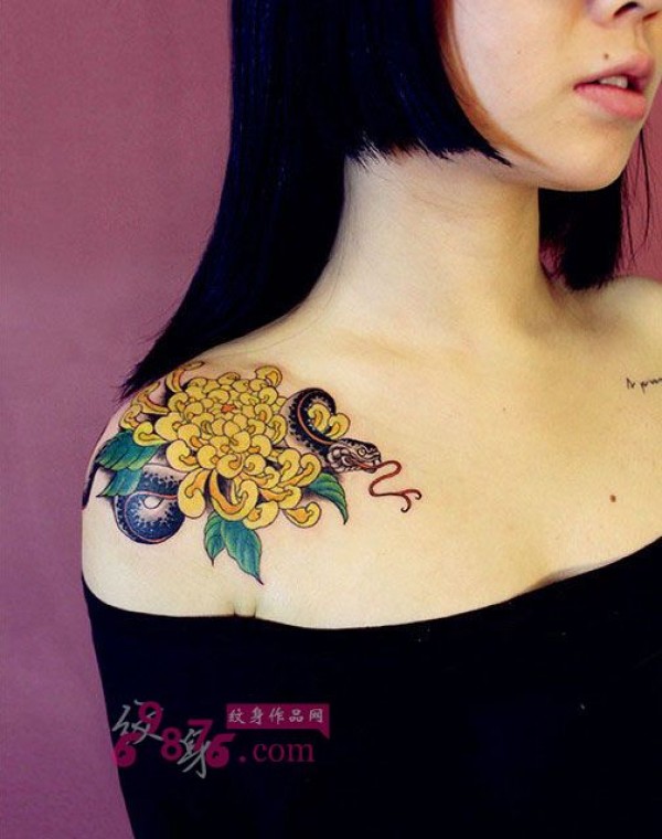 复古菊花与蛇香肩纹身图片