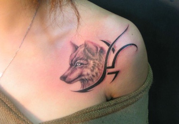 漂亮性感女生肩部狼图腾唯美纹身图案