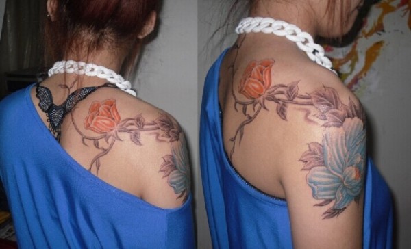 女生肩花纹身_15张女性双肩对称的肩花纹身图案作品图片