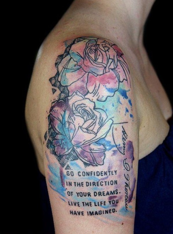 女孩肩头彩色水墨纹身作品图片