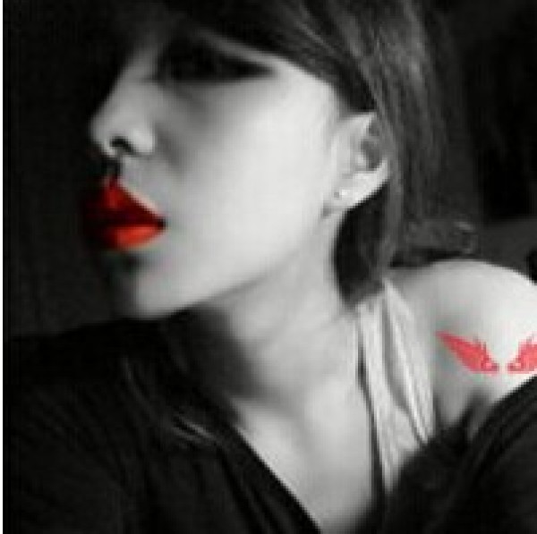 90后红唇美女肩部优雅红色的羽毛纹身图片