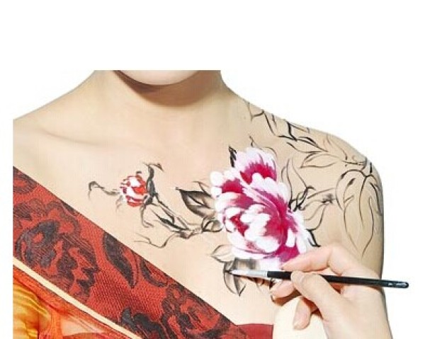 皮肤白皙美女肩部唯美鲜花纹身图案