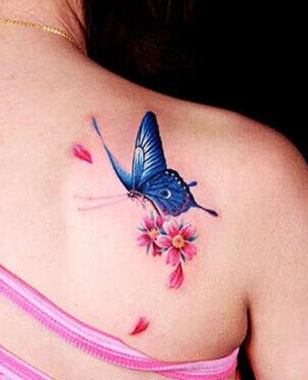 漂亮女生肩部唯美漂亮蝴蝶花丛纹身图图片