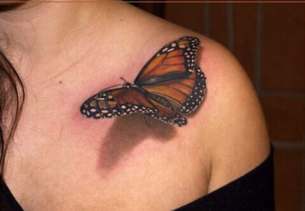 女生肩部逼真3D蝴蝶纹身图片