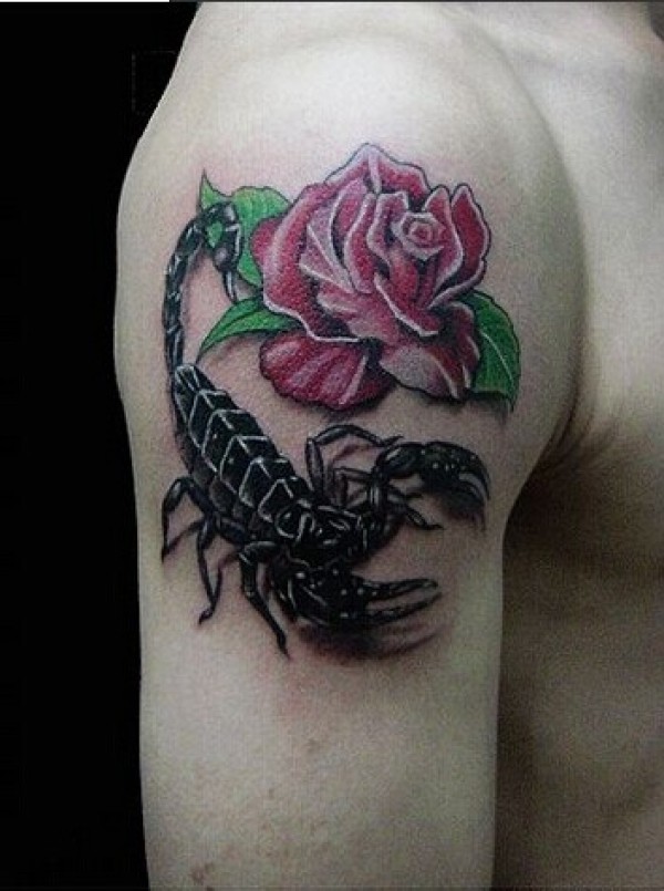 大臂男生肩部高清蝎子玫瑰图案纹身图片