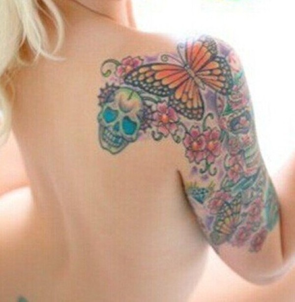 美女肩部蝴蝶与花藤彩色纹身图片