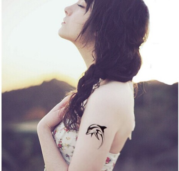 欧美忧郁女生肩部唯美清新小海豚纹身图片