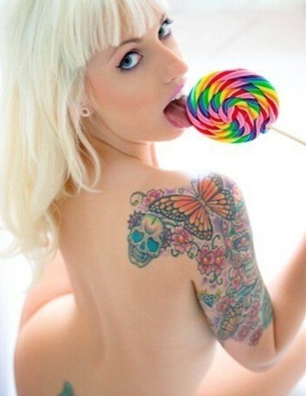一张女生肩部骷髅蝴蝶纹身图案