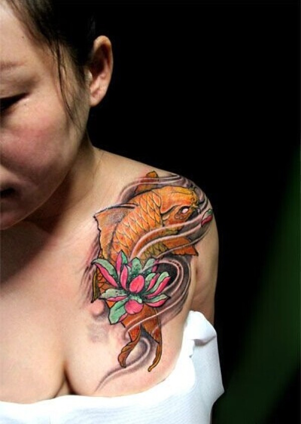 女生肩膀处精美时尚的传统鲤鱼纹身图图片