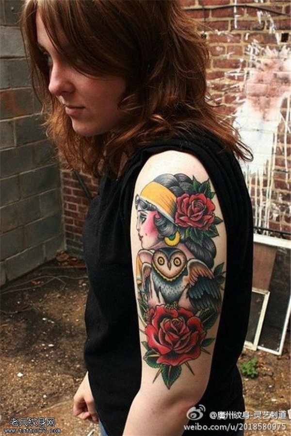 手臂彩色女郎玫瑰花猫头鹰纹身图案
