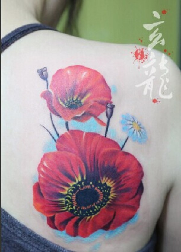 女生肩背唯美漂亮的大红花卉纹身图图片