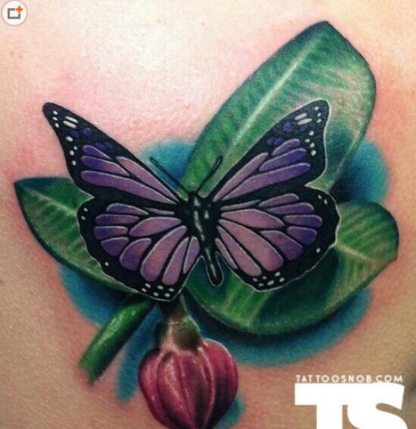 肩部一款个性縁叶蝴蝶纹身图案
