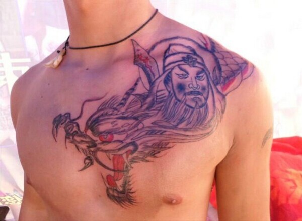 肩部经典漂亮的关公擒龙纹身图图片