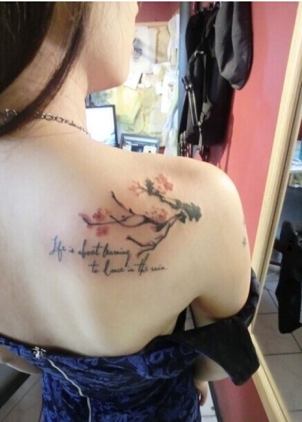 漂亮美女肩部唯美漂亮的梅花英文纹身图片