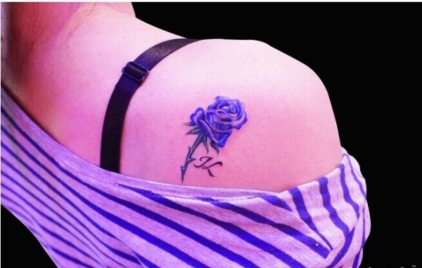 漂亮女生香肩部唯美性感的紫玫瑰纹身图片
