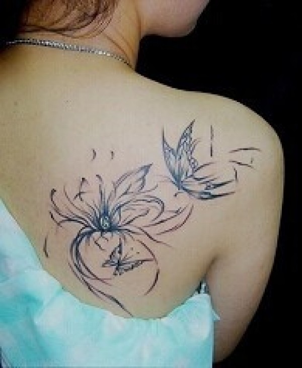 女生肩部唯美简单的花蝴蝶纹身图图片