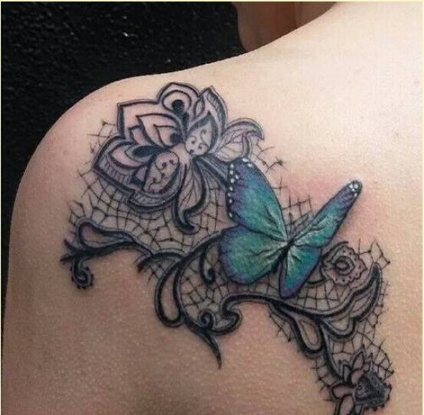 时尚女生肩部漂亮蝴蝶玫瑰纹身图案欣图片