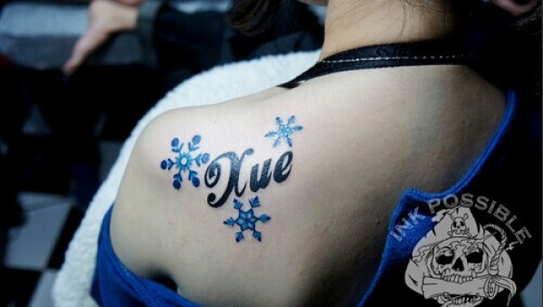 美女肩膀处精美漂亮的雪花与字母纹身图片