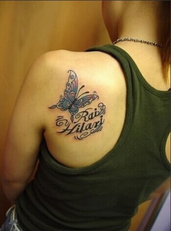 美女肩部漂亮唯美的英文蝴蝶纹身图案