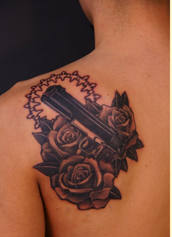 个性时尚肩部漂亮手枪玫瑰纹身图案