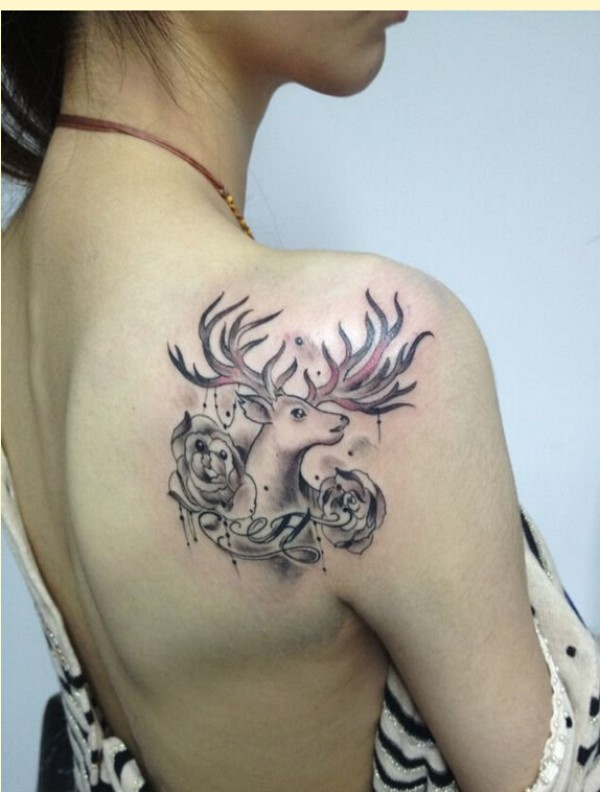 女生肩背漂亮好看的羚羊玫瑰花纹身图图片