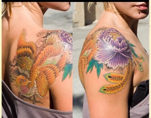 国外美女肩膀漂亮牡丹凤凰纹身图片图片