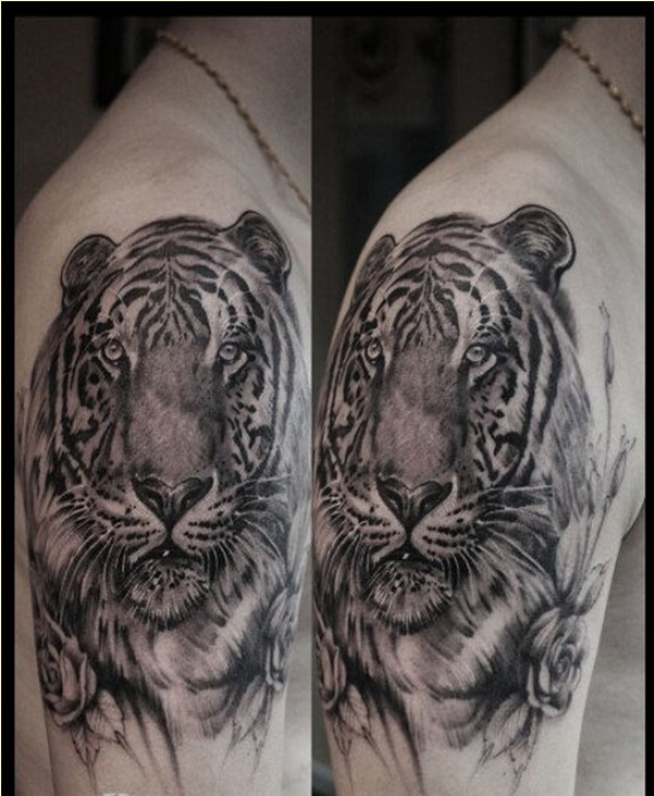 个性肩部时尚蔷薇老虎纹身图案