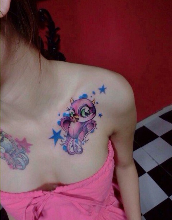 性感女生肩部好看的彩色猫头鹰纹身图图片