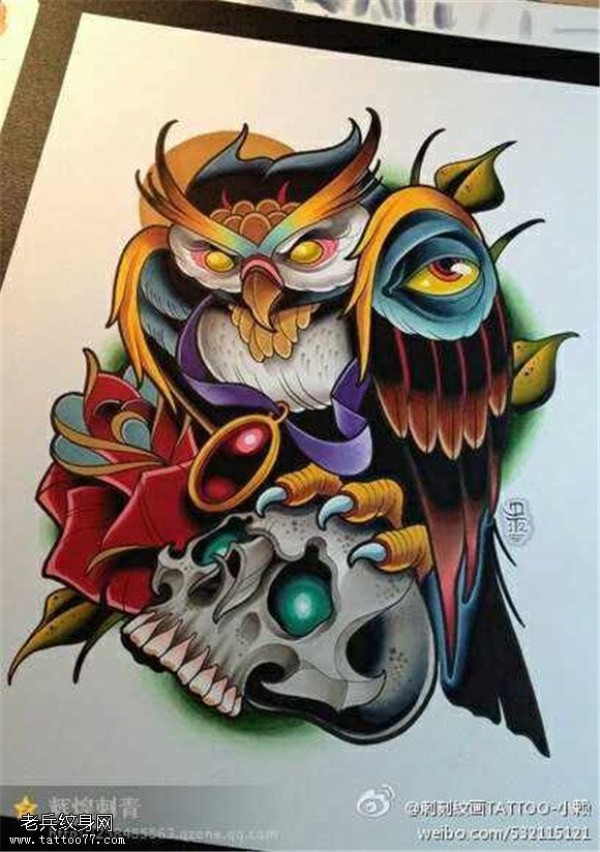 彩色school猫头鹰玫瑰骷髅纹身图片