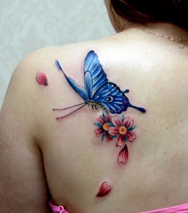 美女肩部经典好看的彩色蝴蝶纹身图案