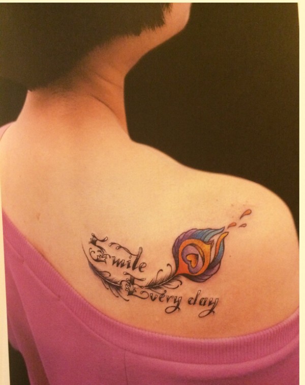 女生肩部漂亮好看的彩色羽毛字母纹身图片