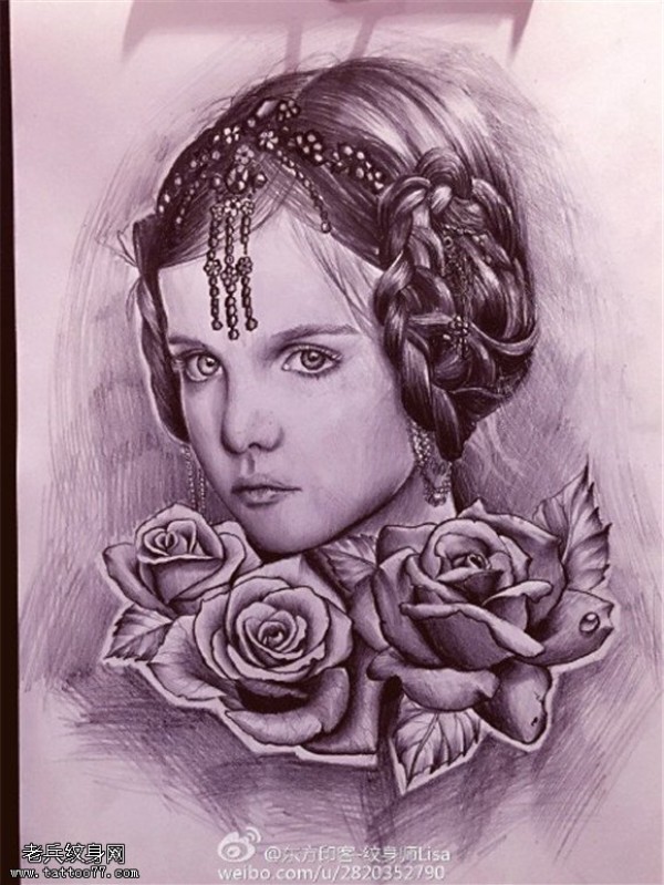 黑灰女郎玫瑰纹身手稿图片