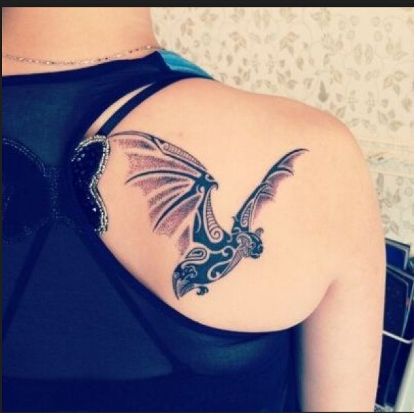 女孩子肩部精美好看的图腾蝙蝠纹身图图片
