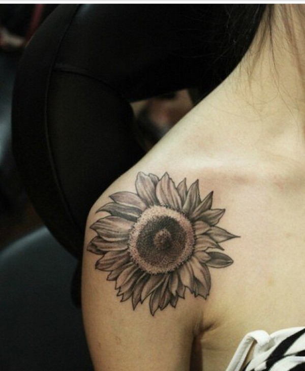 女生肩部漂亮好看的向日葵纹身