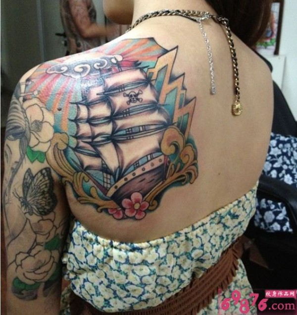 美女后肩部好看的乘风破浪帆船纹身图图片