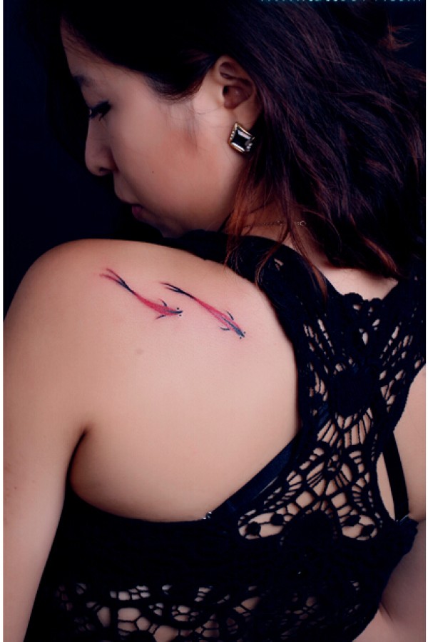 漂亮美女肩背精美好看的水墨鱼纹身图图片