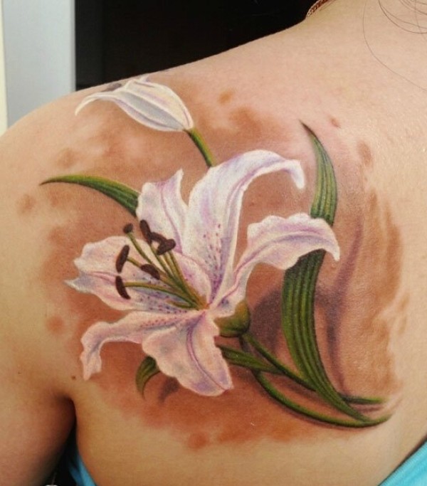 美女肩背精美好看的彩色百合花纹身图图片