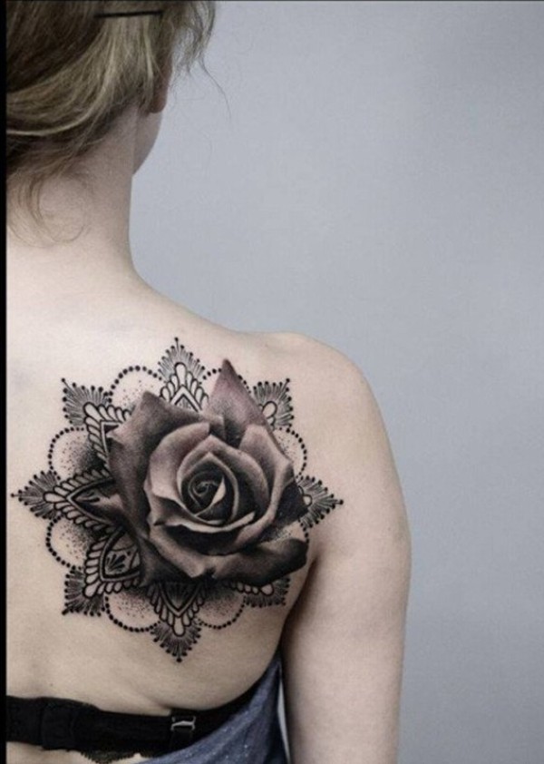 女生肩部漂亮好看的黑灰玫瑰花纹身图图片