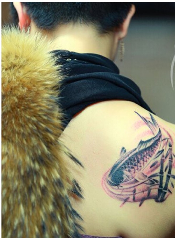 美女后肩背时尚好看的竹子鲤鱼纹身图图片